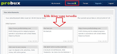 Probux adalah program PTC dimana anda dibayar hanya dengan melihat iklan. PTC ini termasuk PTC baru, launching sekitar bulan agustus 2012. Membayarkah PTC ini? Ya, sampai detik saya mempostingkan artikel ini probux masih membayar. Bukti pembayarannya bisa anda kunjungi forum probux. PTC Investigations,www.ptc-investigation.com dengan alasan tertentu tidak merekomendasikan PTC untuk anda ikuti dan berinvestasi website ini. Jadi, anda patut berhati-hati bila anda ingin serius berinvestasi di probux karena terbilang masih sangat baru dan sudah ada warning dari www.ptc-investigation.com, tapi tidak masalah bila anda ingin mencoba PTC yang satu ini karena masih membayar."Mirip neobux" sangat mirip neobux. Begitu kira-kira gambaran PTC yang satu ini. Hampir semua fitur-fitur yang ditawarkan sama dengan yang ditawarkan neobux. Bagi anda yang sudah familiar dengan neobux mungkin akan mengatakan hal yang sama seperti apa yang saya katakan. Mudah-mudahan kualitasnya pun bisa menyamai kualitas saudara kembarnya "neobux". Perbedaannya mungkin ada pada fixed advertisementnya yang bernilai $0.01 per klik. Artinya, anda akan lebih cepat cashout dibandingkan neobux.